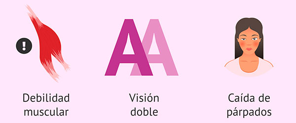 A menudo, los primeros síntomas de una miastenia gravis afectan los ojos presentando una ptosis o caída de los párpados, esta puede afectar a un solo ojo. También pueden presentar debilidad en brazos piernas que empeora durante el día, así como dificultad para respirar, hablar o masticar.